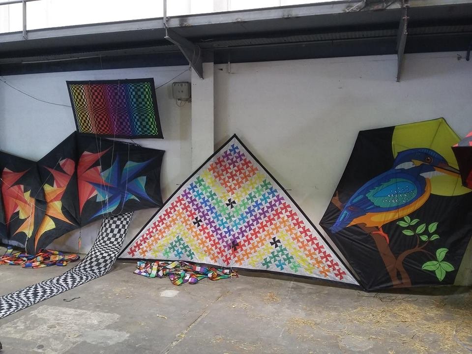 Repli dans le hangar désaffecté à proximité et mise en place d’une expo de cerf-volants, du vol indoor et de la fabrication pour enfants, on sauve les meubles, le public, lui, afflue toujours.