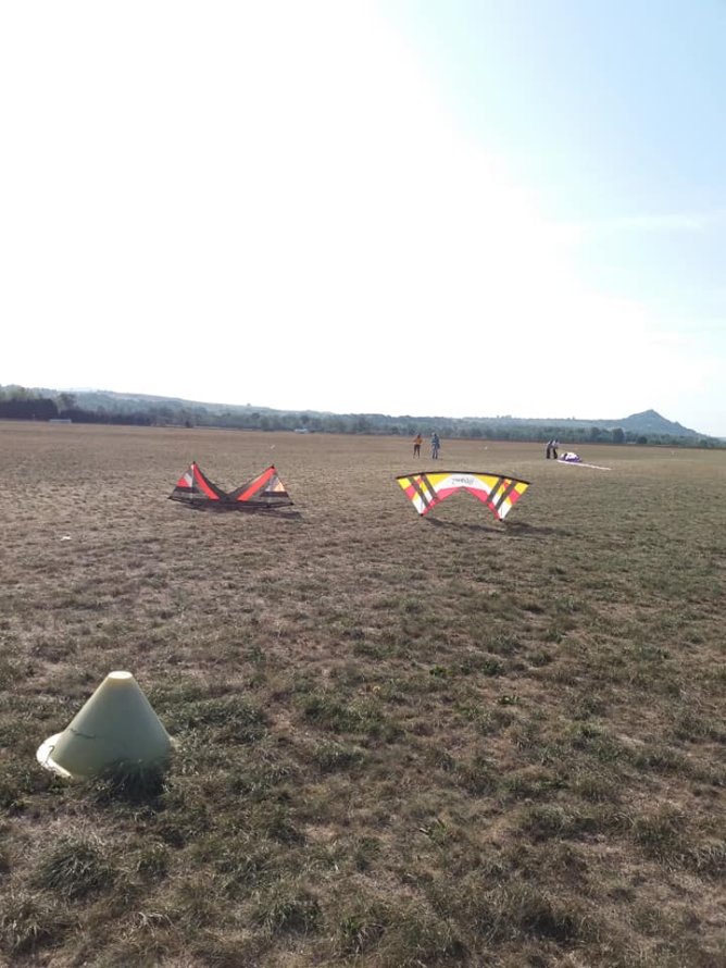 Nous avons donc dû partager notre planning avec ce meeting aérien. Notre plage de vol étant concentrée entre 9h et 14h. Une belle zone fut mise à notre disposition, la partie sud de l’aérodrome (environ 400m x 300m ) sur laquelle on pu évoluer cerfs-volants mono-fil, pilotables 2 et 4 lignes.