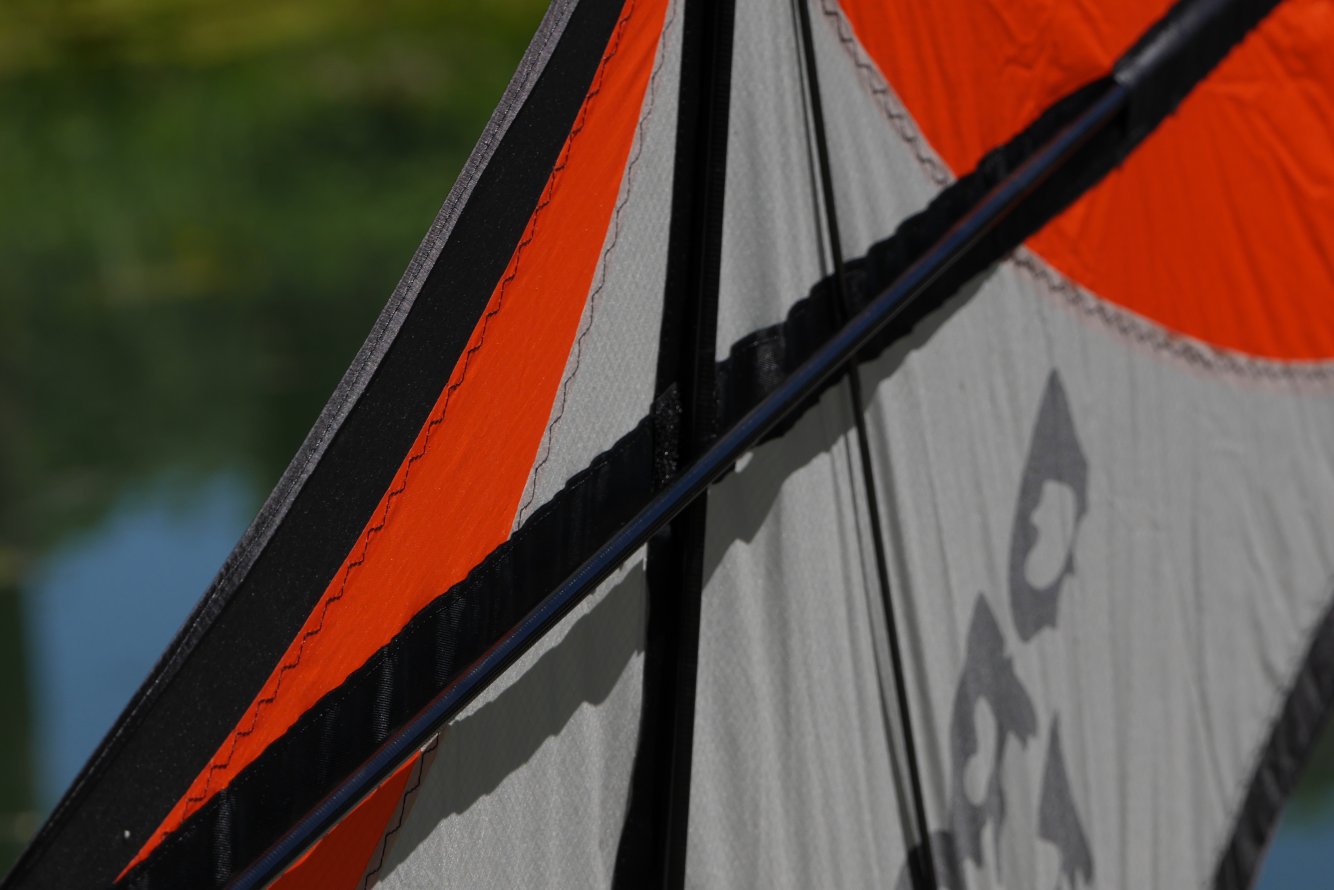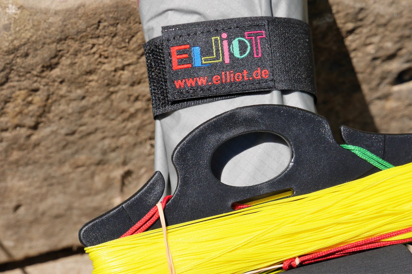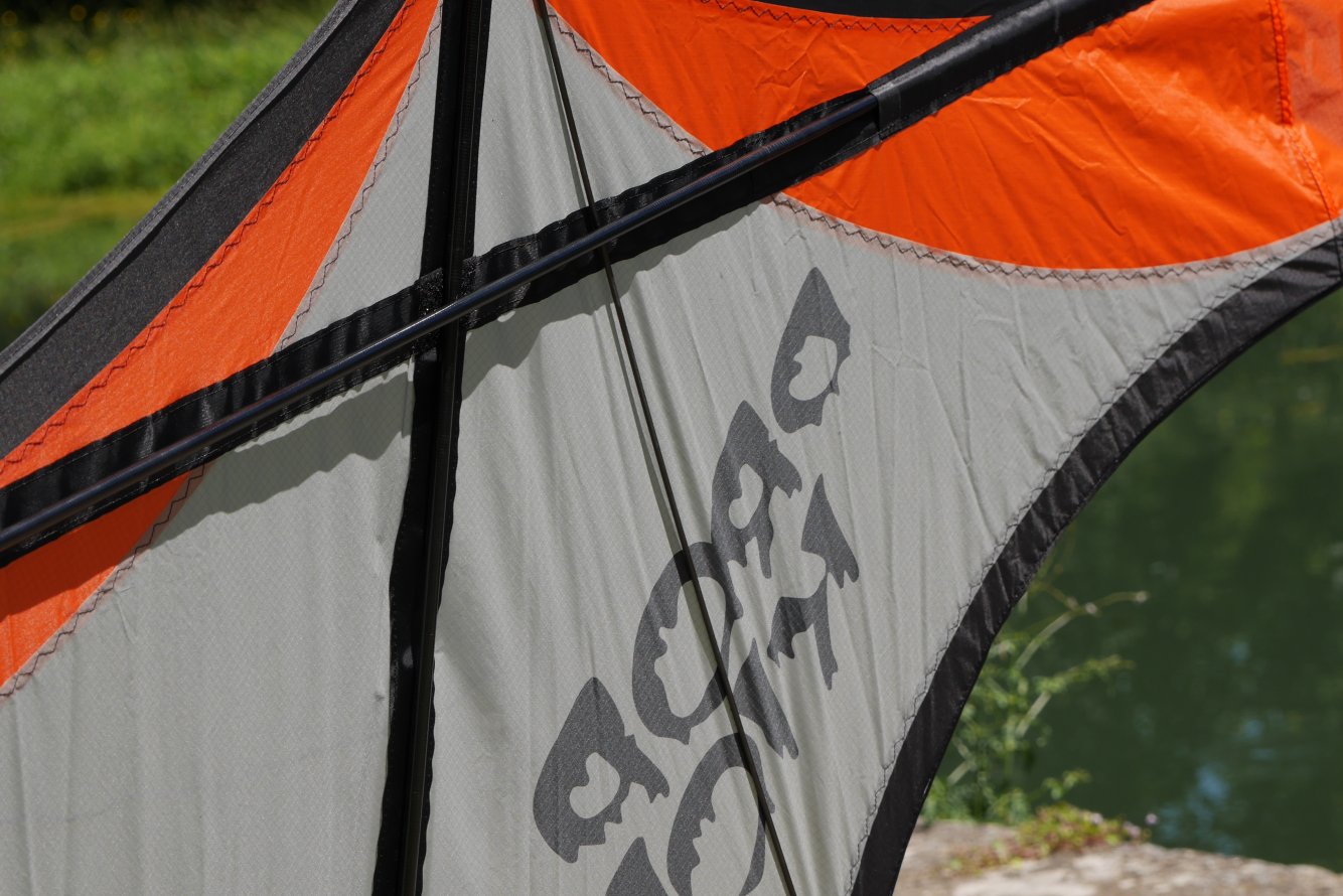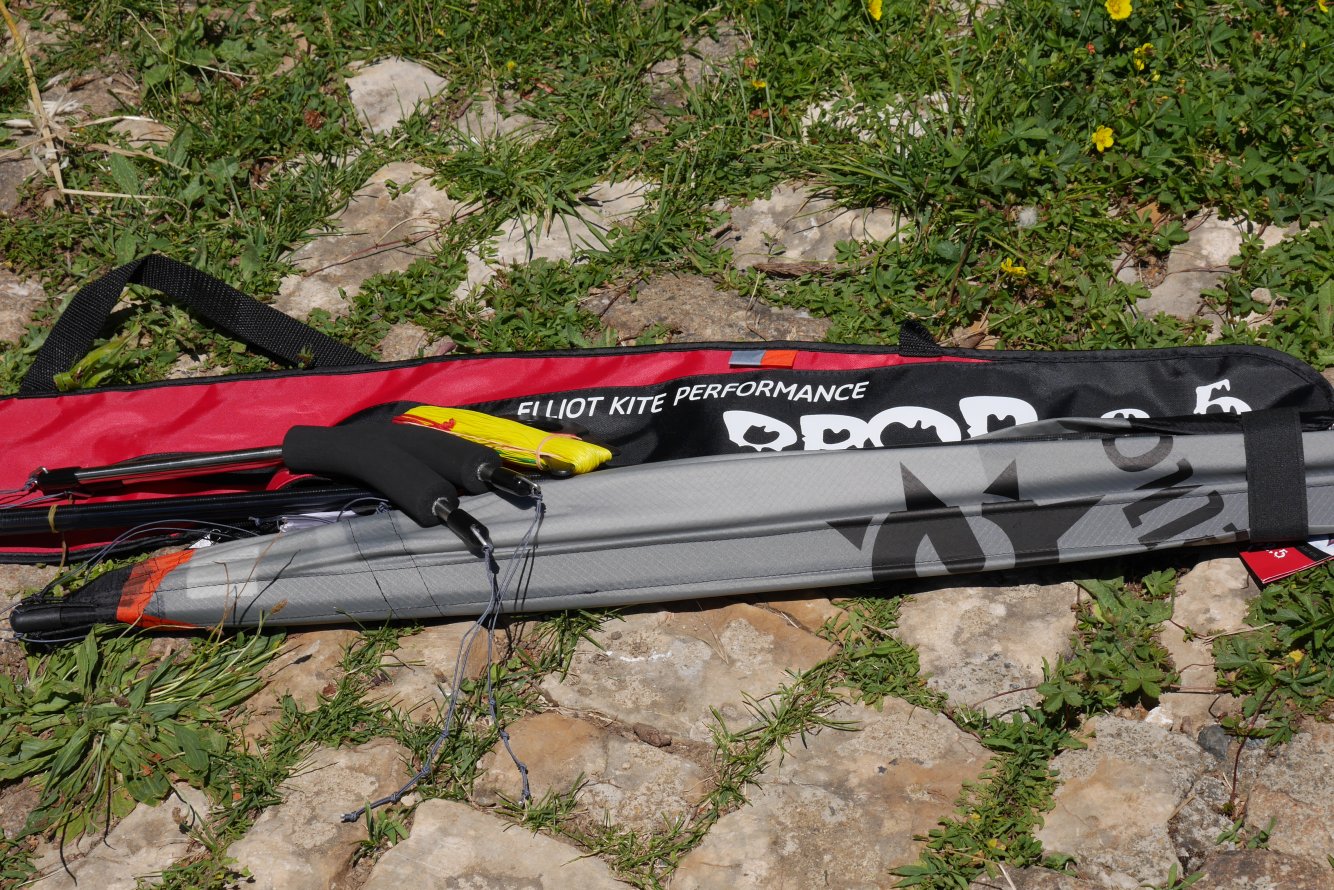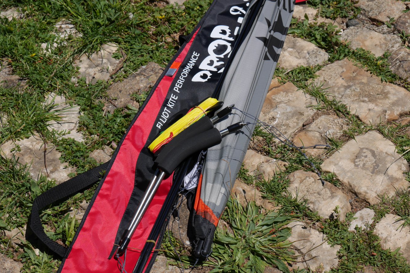 La housse haut gamme, ouverture sur le coté avec fermeture éclair. A l’intérieur un petit filet pour les poignées et les lignes. La housse est sérigraphiée avec les couleurs qui sont sur le coté. Le look est très joli, les écritures sont top. Pour les poignées, là, rien à dire, c’est du top avec les Quad + échelle de noeuds. Sur les lignes rien à dire non plus, bien égalisées, par contre la plaquette qui est fournie avec n’est vraiment pas adaptée pour ce genre de lignes car elle est vraiment trop petite (il faudra penser à la remplacer pour quelques petits euros). Un petit velcro avec le logo nous permet de réunir le cerf-volant avec ses barres.